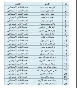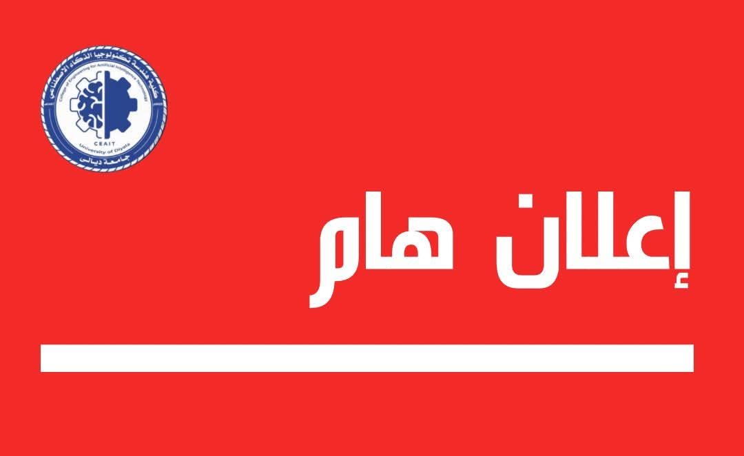 تعلن عمادة كلية هندسة تكنولوجيا الذكاء الاصطناعي/جامعة ديالى عن قبول الطلبة في الدراسة المسائية للسنة الدراسية 2025-2026 (القناة العامة) في الاقسام الآتية: