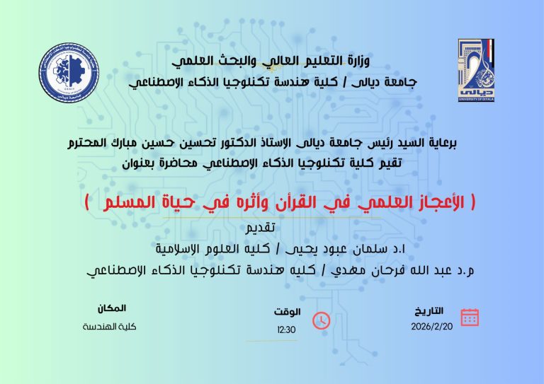 بحضور السيد رئيس جامعة ديالى المحترم، جرت في أروقة الجامعة مراسيم توقيع اتفاقية التوأمة والتعاون العلمي المشترك بين كلية هندسة تكنولوجيا الذكاء الاصطناعي وكلية الهندسة في جامعة الصفوة الجامعة، متمثلةً بقسم هندسة الذكاء الاصطناعي. وشهدت مراسيم التوقيع حضور السيد عميد…